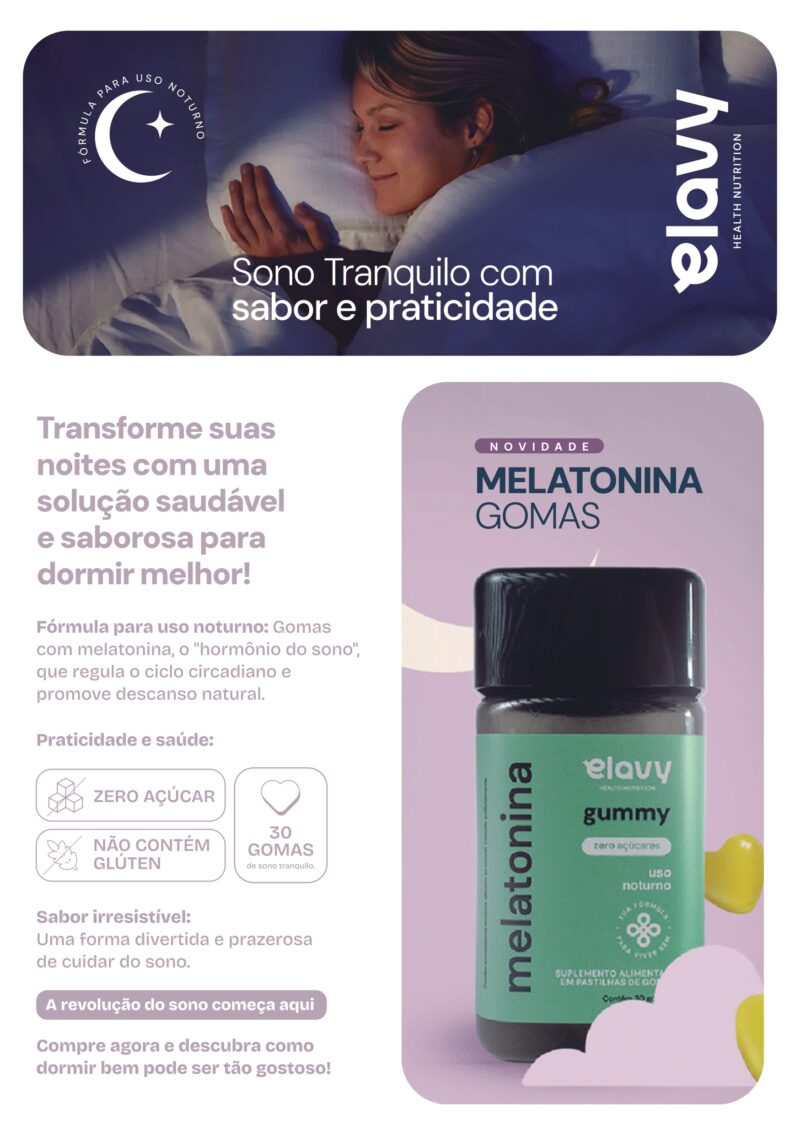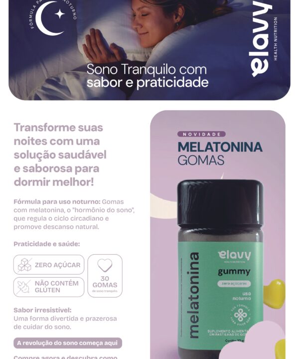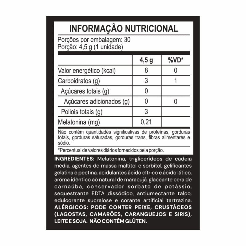 Cada goma contém 0,21 mg de melatonina, o “hormônio do sono”, que auxilia no estabelecimento de um ciclo de sono regular e saudável promovendo um descanso reparador. A ausência de luz é fundamental para contribuir com um sono reparador.