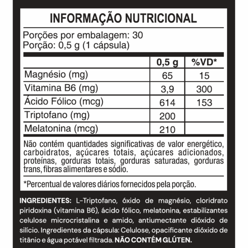 Produto indicado para o grupo populacional acima de 19 anos. Este produto não é um medicamento. Não exceder a recomendação diária de consumo indicada na embalagem. Mantenha fora do alcance de crianças. Este produto não deve ser consumido por gestantes, lactantes, crianças e pessoas envolvidas em atividades que requerem atenção constante. Pessoas com enfermidades e/ou sob o uso de medicamentos, consulte um médico.